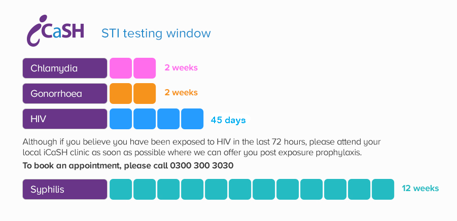 Symptoms of an STI could include discharge, pain while passing urine, genital lumps, genital sores or lower abdominal pain in women. If you have any of these symptoms, please contact your local iCaSH clinic on 0300 300 3030.